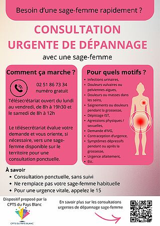 • Sages-femmes : saignements, douleurs mammaires, gêne intime, contraception d’urgence, IVG médicamenteuse, dépistage IST, soutien psychologique…